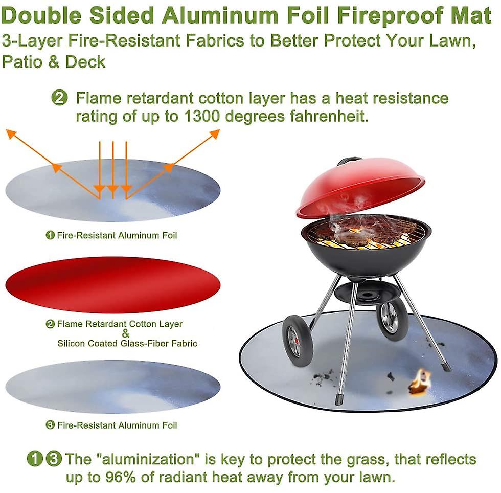 Protect Your Lawn: For the advanced of aluminum foil layer, KINGXBAR fire pit mat reflects 96% radiant heat to protects grass from death from baking. Whether your surface is wood, composite, stone, or concrete, our fire pit mat will protect your patio surface from burns, heat damage, heat deformation, grease spills, cement stains and more.