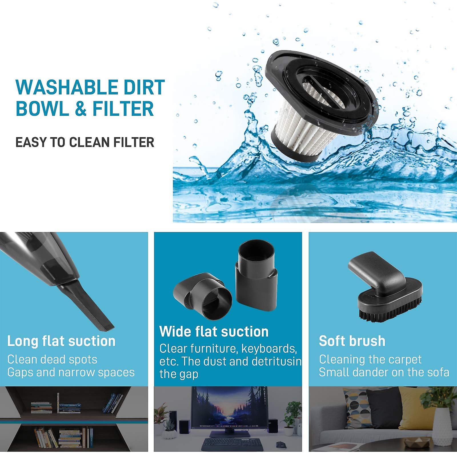 Equipped by 2200mAh rechargeable lithium-ion battery and quick charge tech, Handheld vacuum cleaner delivers up to 20-25 minutes of continuous run time after 2-3 hours full charge. It can meet the need for deep cleaning dust from your kitchen, living room to bedroom.