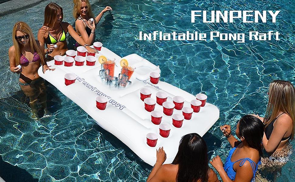 The Pool Pong Party Barge is the first and only floating beer pong table to include a built-in cooler so ice-cold drinks are always within reach. The 6ft x 3ft table includes 10 cup triangles on each end for full size pool pong play. Each side of the raft is also lined with 4 cup holders for social floating, so you and friends can float and socialize around the table between pong games.