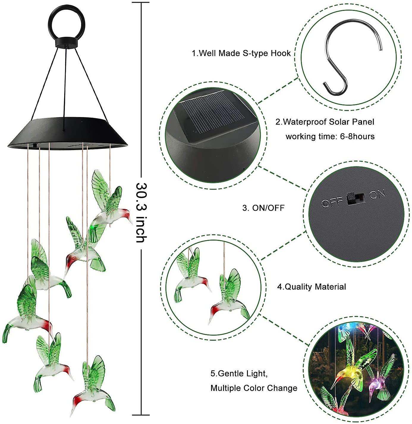 Energy Efficient Solar Powered Lights: The LED lights featured in the bird wind chime are solar powered and energy efficient. Takes little effort to install.