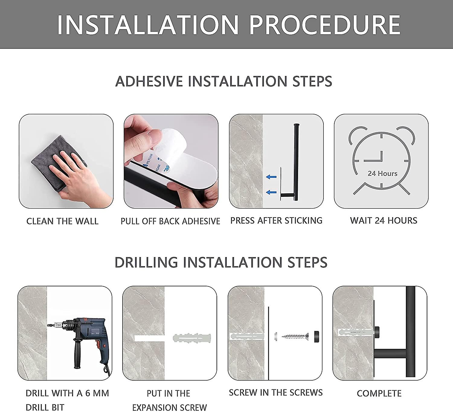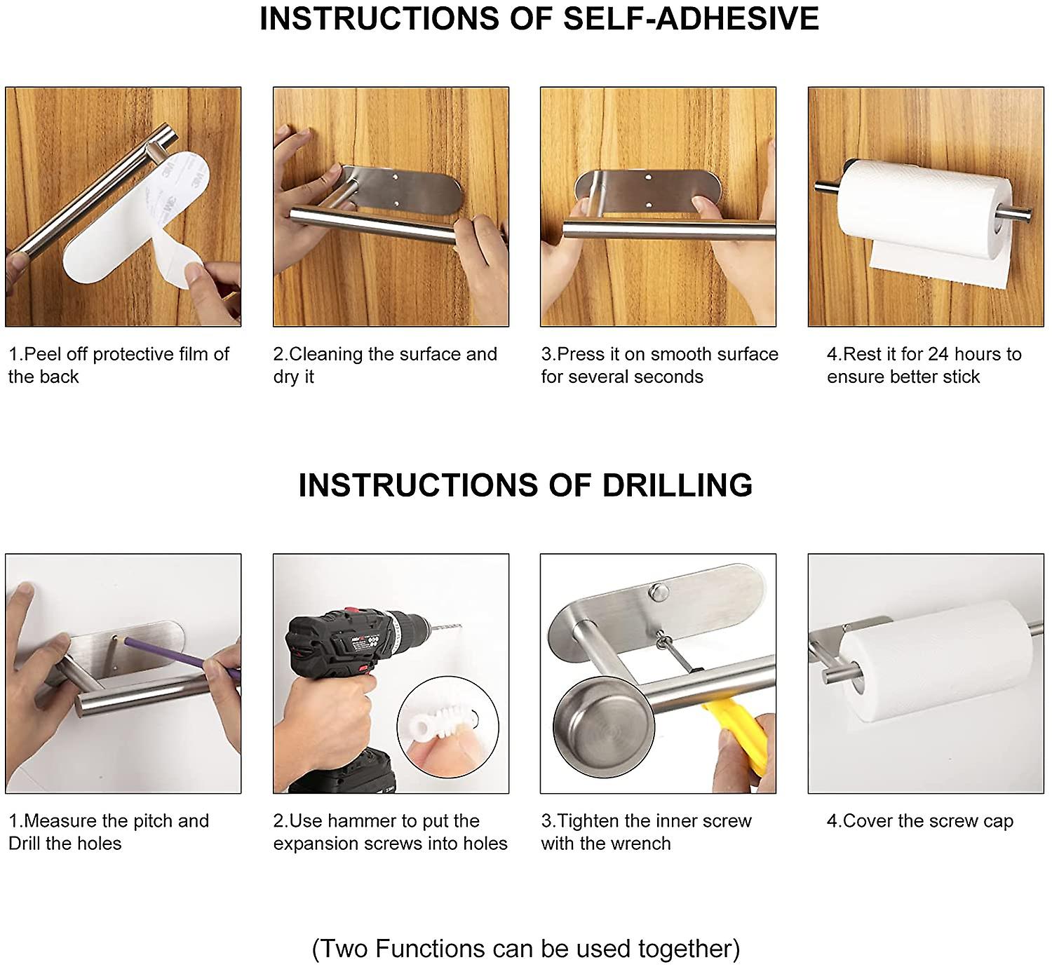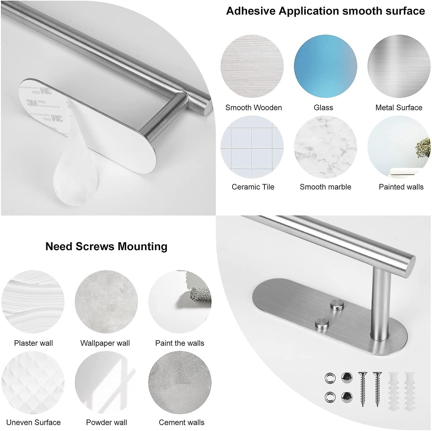 Punching or Adhesive Installation Methods and Suitable for Any Surface: Our paper towel wall mount comes with super strong adhesive and small bag screw, we can install the undercounter paper towel holder on any smooth surface such as tiles, glass, wood, marble, metal. But attention, the adhesive cannot adapt to rough surfaces, we can install our stainless steel paper holder with screws, double row hole design for paper holder is convenient to install with a screwdriver.