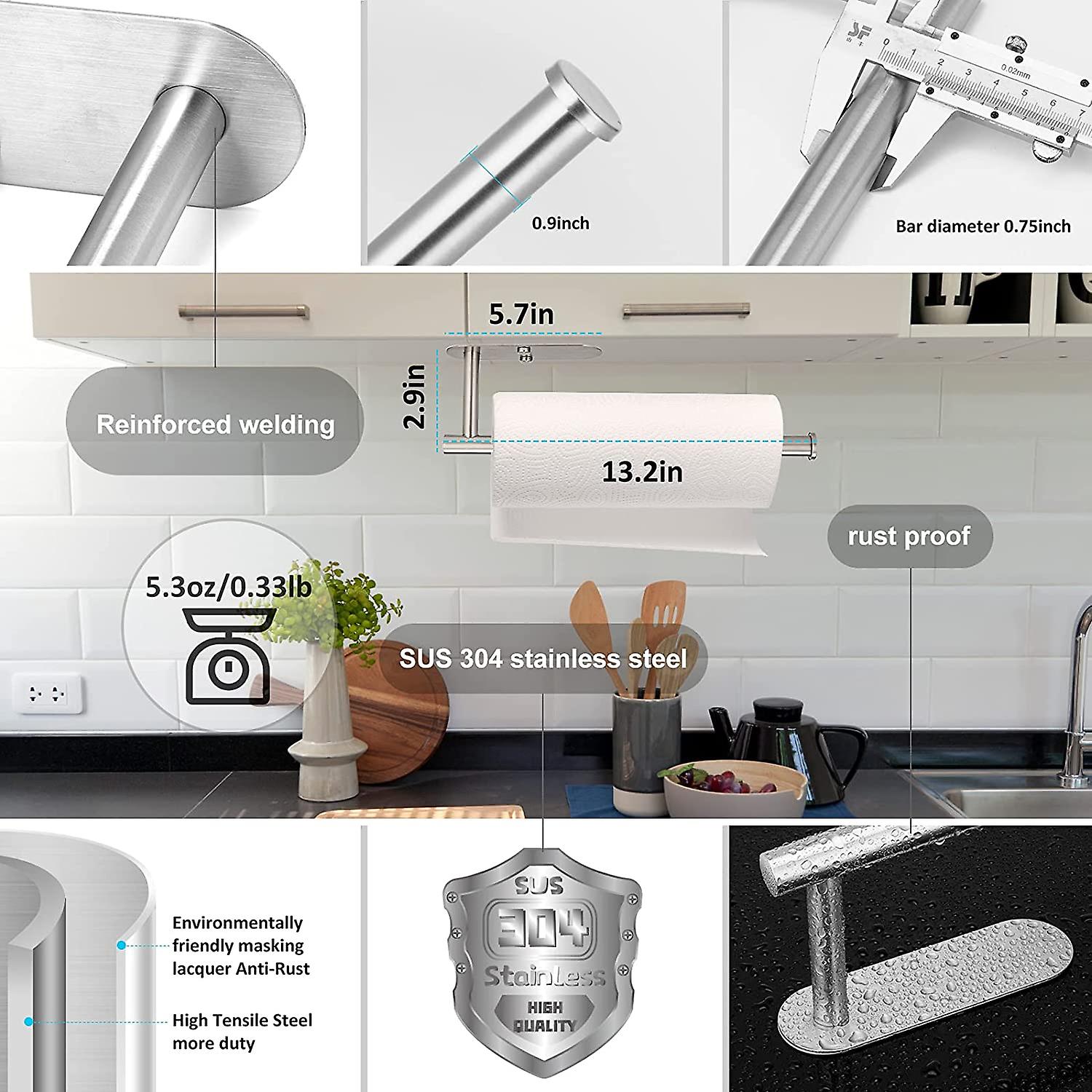 HIGH QUALITY MATERIAL AND FASHIONABLE DESIGN: The paper towel holder is made of high quality SUS 304 stainless steel. Not only premium quality, our hanging paper towel holder is also trendy and modern in design, the simple, elegant yet luxurious is perfect for your kitchen, bathroom, and anywhere in your home. Decorate your home in modern style now.