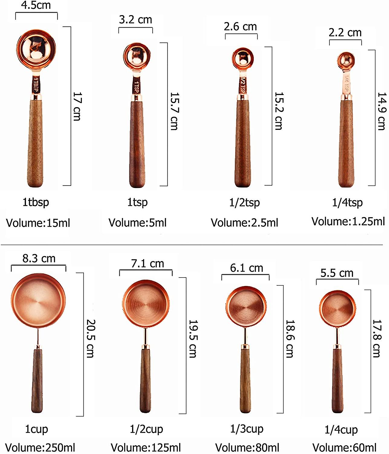 This stainless steel measuring set includes 4 different spoon sizes, 1/4 cup, 1/3 cup, 1/2 cup, 1 cup (60ml, 80ml, 125ml and 250ml), and 4 different cups sizes, 1/4Tsp, 1/2Tsp, 1Tsp, 1Tbsp (1.25ml, 2.5ml, 5ml, 15ml), meet all your needs on cooking and baking.