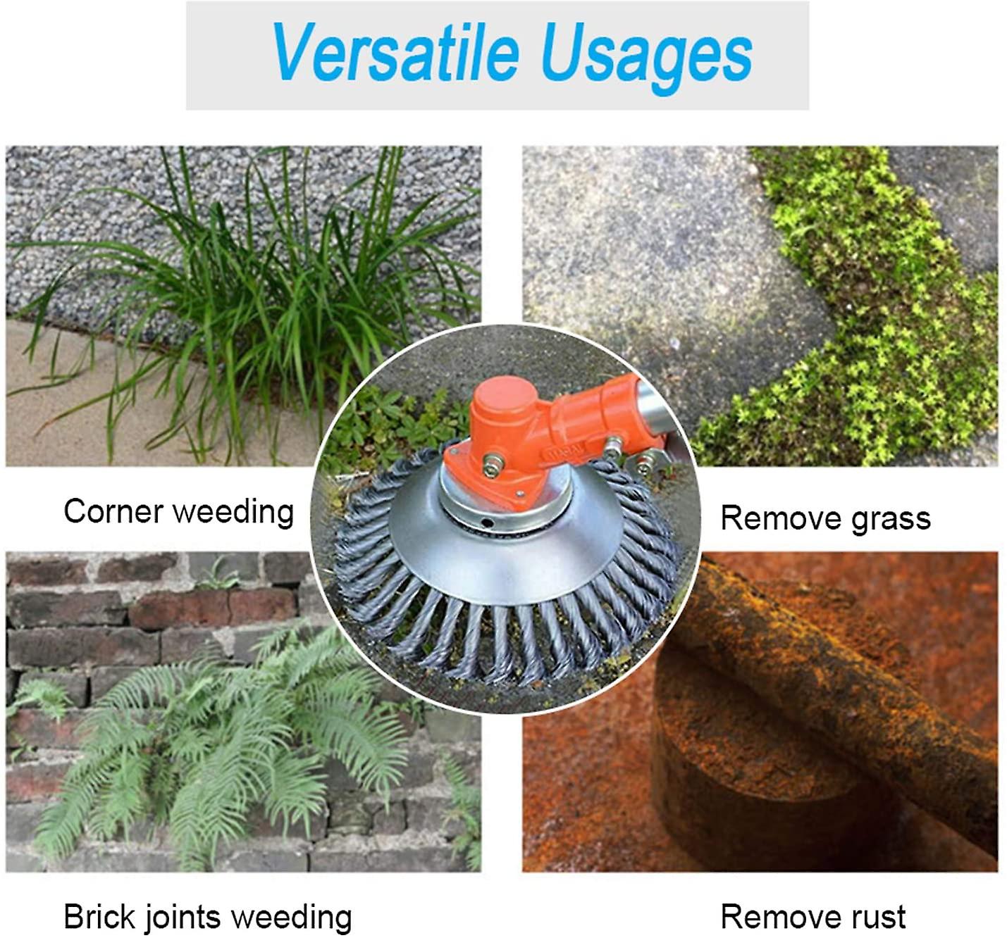A variety of functions: Our steel brush fits the most of the brushcutters.Suitable for weeding in various places (corners or brick joints), especially suitable for brick wall, paving stones, sidewalk joints. You can effortlessly remove all unsightly, stubborn moss and weeds in lawns / green spaces, gardens, parking lots, plant walls, sidewalks, grass and stone roads, farm grass, orchards, rustproof iron plates, etc.
