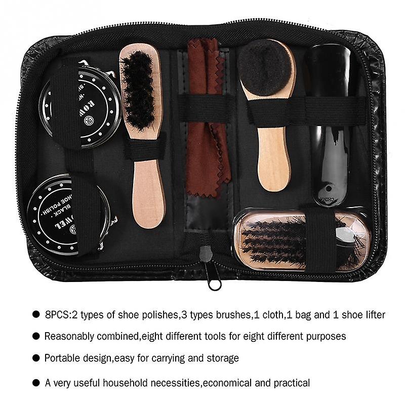 (Including 2 types of shoe polishes, black & neutral; 3 types brushes: one long handle pig hair brush, one sponge brush for applying polish and one oval brush for cleaning dust; 1 cloth, 1 bag and 1 shoe lifter.)