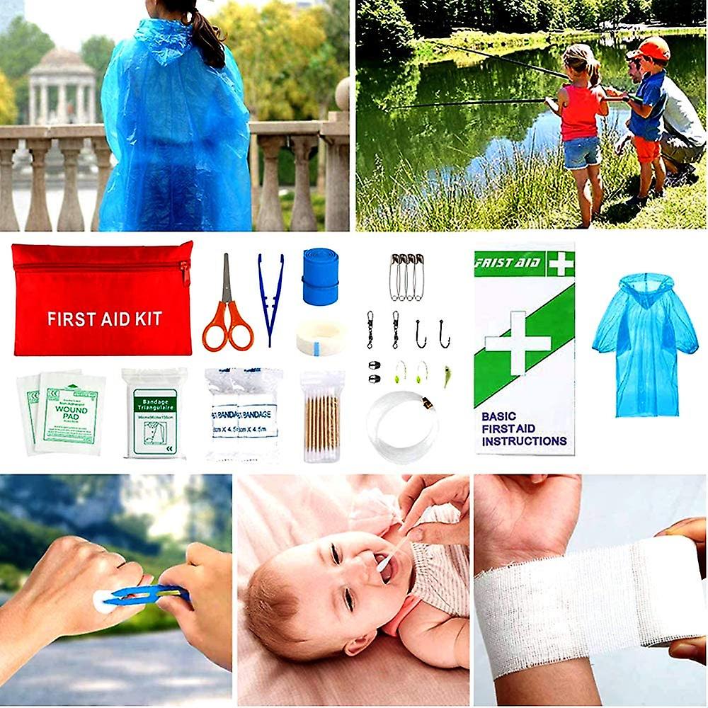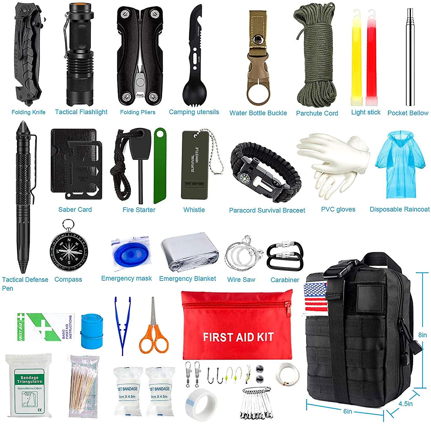 Basic Tactical First Aid Kit: Comes with a first aid kit with a bright red bag that includes essentials such as pliers, scissors and pins, bandages, emergency mask, triangle bandage, cotton swabs, etc. They can help stop enlargement of bleeding from minor injuries, mobilize injured limbs, and even dress wounds to prevent infection.WIDE APPLICATION: This set of first aid survival gear is ideal for tactical medics, military personnel, police, firefighters, first aid personnel, hikers, campers, outdoor sports enthusiasts, etc. . Great for Car, Boat, Bikes, Motorcycles, Workplace, Travel, Shooting, Hunting, Camping, Hiking, Fishing, Boating, Cycling, Outdoor Sports, wild adventures and other activities.