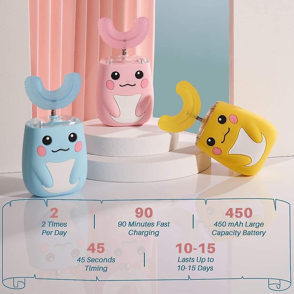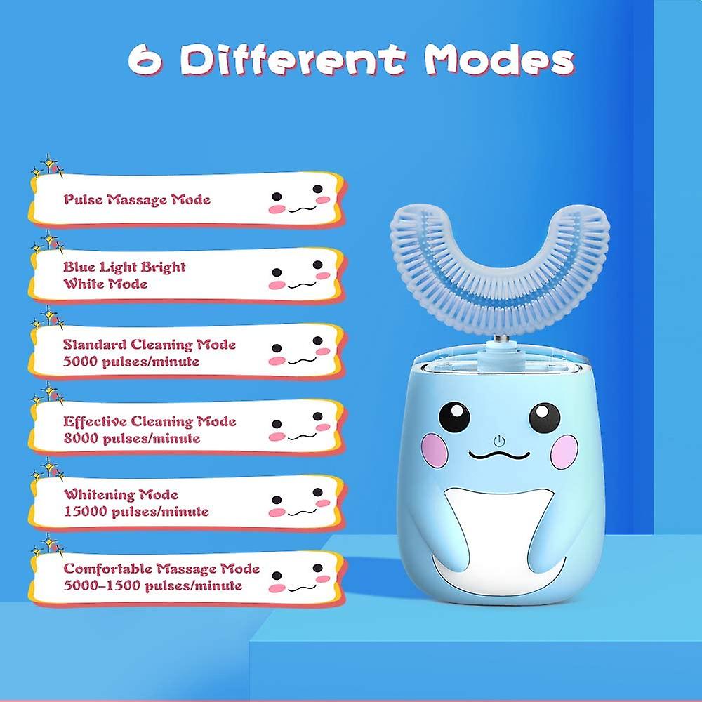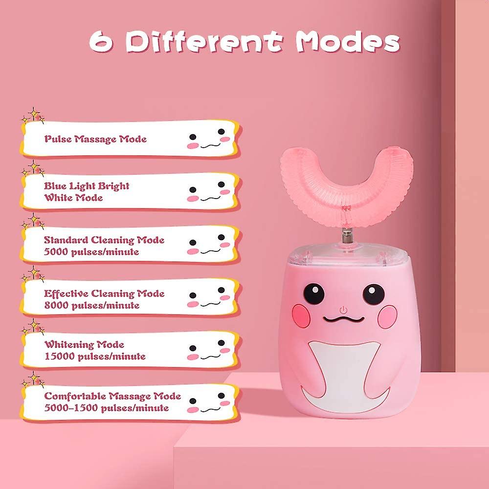 This soft Kids Electric Toothbrush rechargeable can accompany children to play, easy and fun, to complete teeth cleaning. And cultivate children's good tooth brushing habits. Try U-shape automatic toothbrushes mouthpiece to save you the cost of buying toys and visiting the dentist at the same time. The ergonomic U-shaped brush head of this best kids electric toothbrush is suitable for the shape and mechanics of the toddler's tooth structure. Food-grade silicone material, with round soft brush head, can care for children's tender gums and protect children's tooth enamel. The automatic toothbrush 360 can be used safely and will not cause adverse effects on kids. It has the functions of drying,effective deep cleaning. Kids 360 automatic toothbrush has a six-speed mode and 45 seconds of scientific function. It is smarter, the vibration frequency is increased to 20,000,and 6D covers toddler's teeth in all directions. Once installed in place, it can brighten teeth and whitening effects, and the scientific 45 brushing method can make your son or daughter teeth cleaner. When the USB sensor is connected, kids electric toothbrush boys can be charged immediately. When toddler automatic toothbrushes connected to USB for charging, the kids electric toothbrush girls only takes 1.5 hours to charge for 2 weeks. Safe, fast, convenient, easy to use at home or travel. Baby ultrasonic U shaped toothbrush adopts the omni-directional IPX7 waterproof seal design, durable to use can be cleaned and reusedsafely used at bath and shower. Rated Voltage: 3.2~3.7V. Rated Power 5W. Work Current 1.6A. Charging Time 120minutes. Type: 360 Sonic Automatic Whitening Toothbrush.