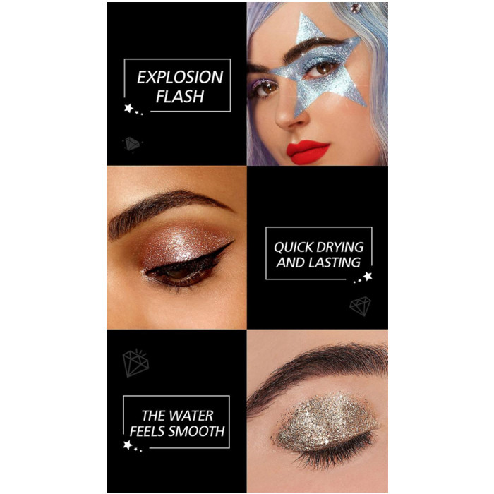 Diamond Glitter Eyeshadow:The glitter liquid eye shadow designed for glitter & shimmer eyes looks which successfully spotlights the eye contour and make you be the attention-catcher in each event.