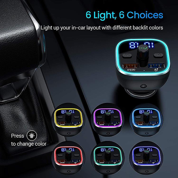 This Bluetooth V5.0 FM transmitter has 6 coloured ambient lights, which can be switched to green/ red/ blue/ yellow/ cyan/ purple. 6 colourful LED breath light makes your car interior layout cooler and more attractive. It also makes it easier to use and safer driving at night. Makes driving more fun.