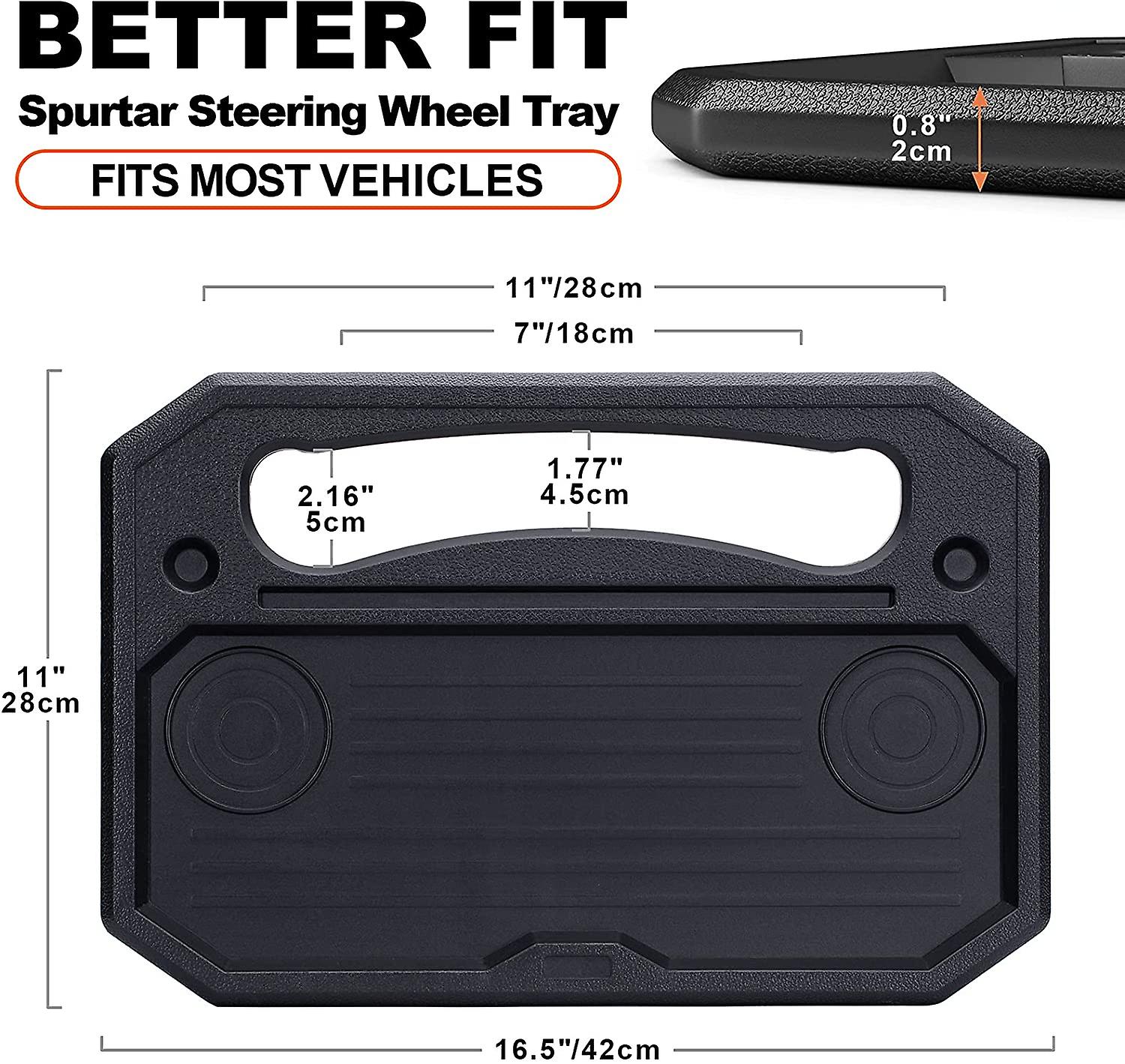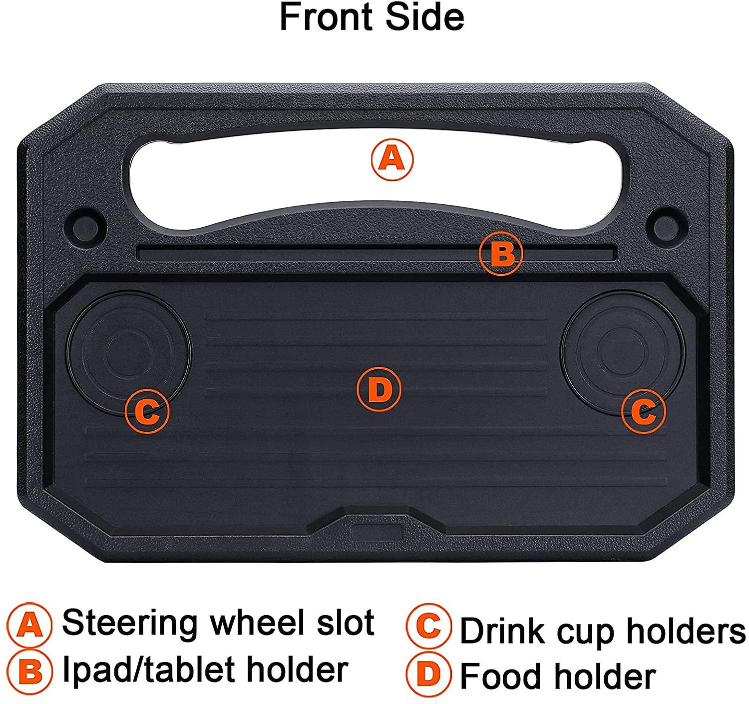 Sturdy and Durable: The ergonomic car tray is made of high quality plastic material. its sturdy and stable enough to support a laptop, tablet, notebook or a full lunch with drinks. Clean easily after use. The steering wheel tray is made to a very high standard,which give this tray a good look and a super long life.