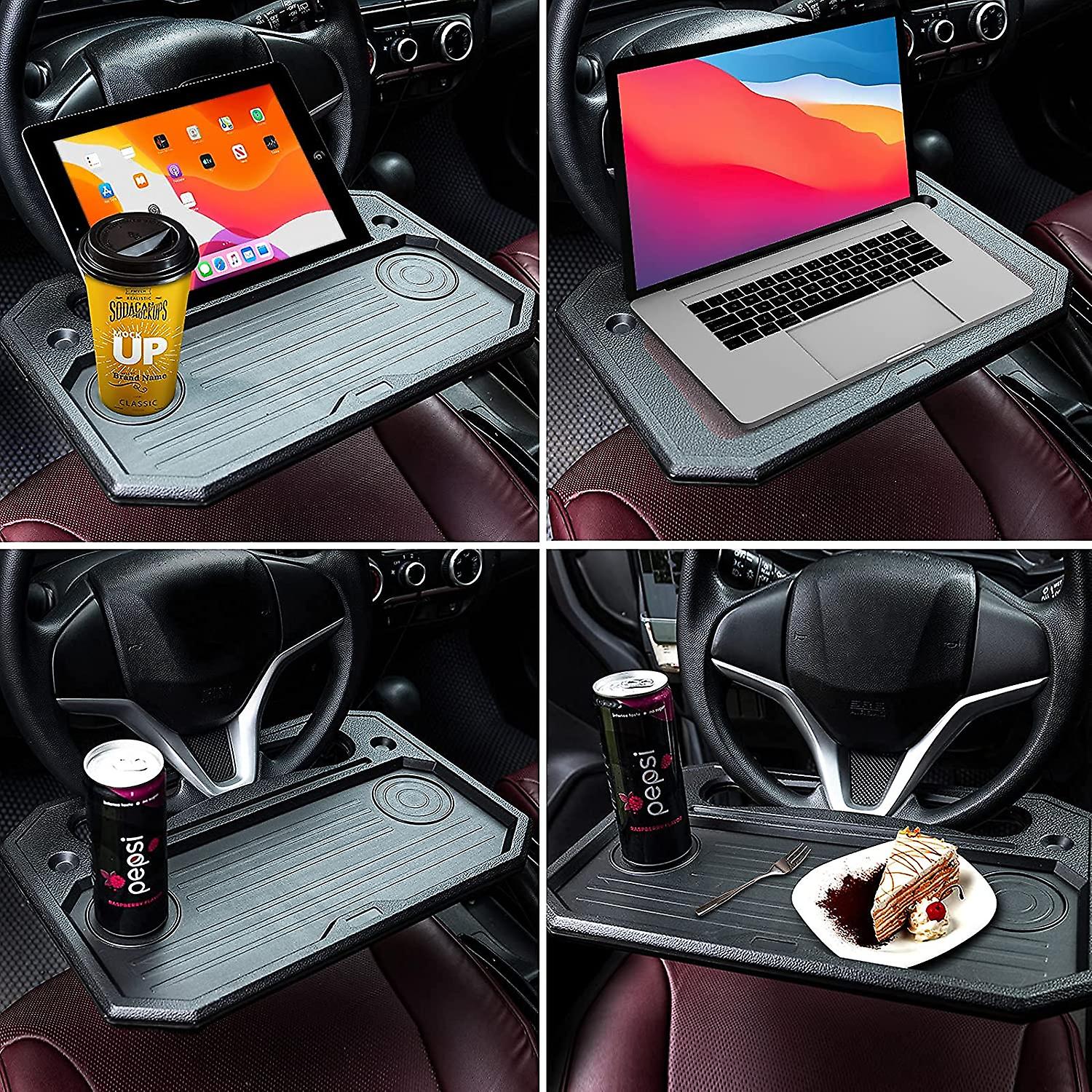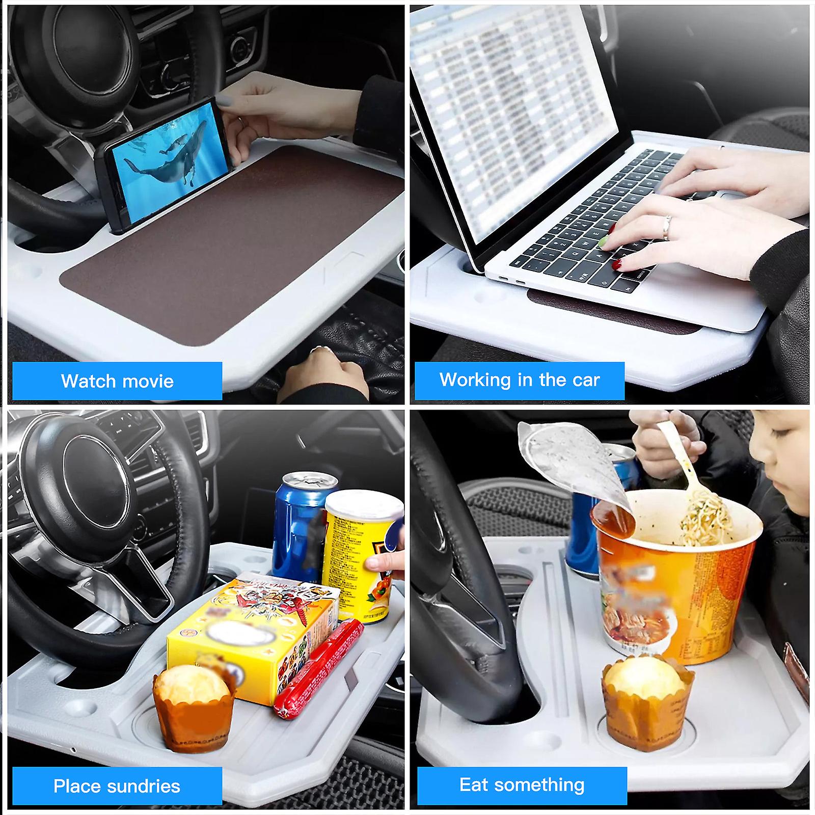 Multifunctional: The 2-side car steering wheel desk is a cool car gadget for your car. One side is designed as a food tray with cup holder to have a quick snack or breakfast. The other side is a laptop desk as a car office to work or study. The great car accessories make work or eating super convenient and comfortable.
