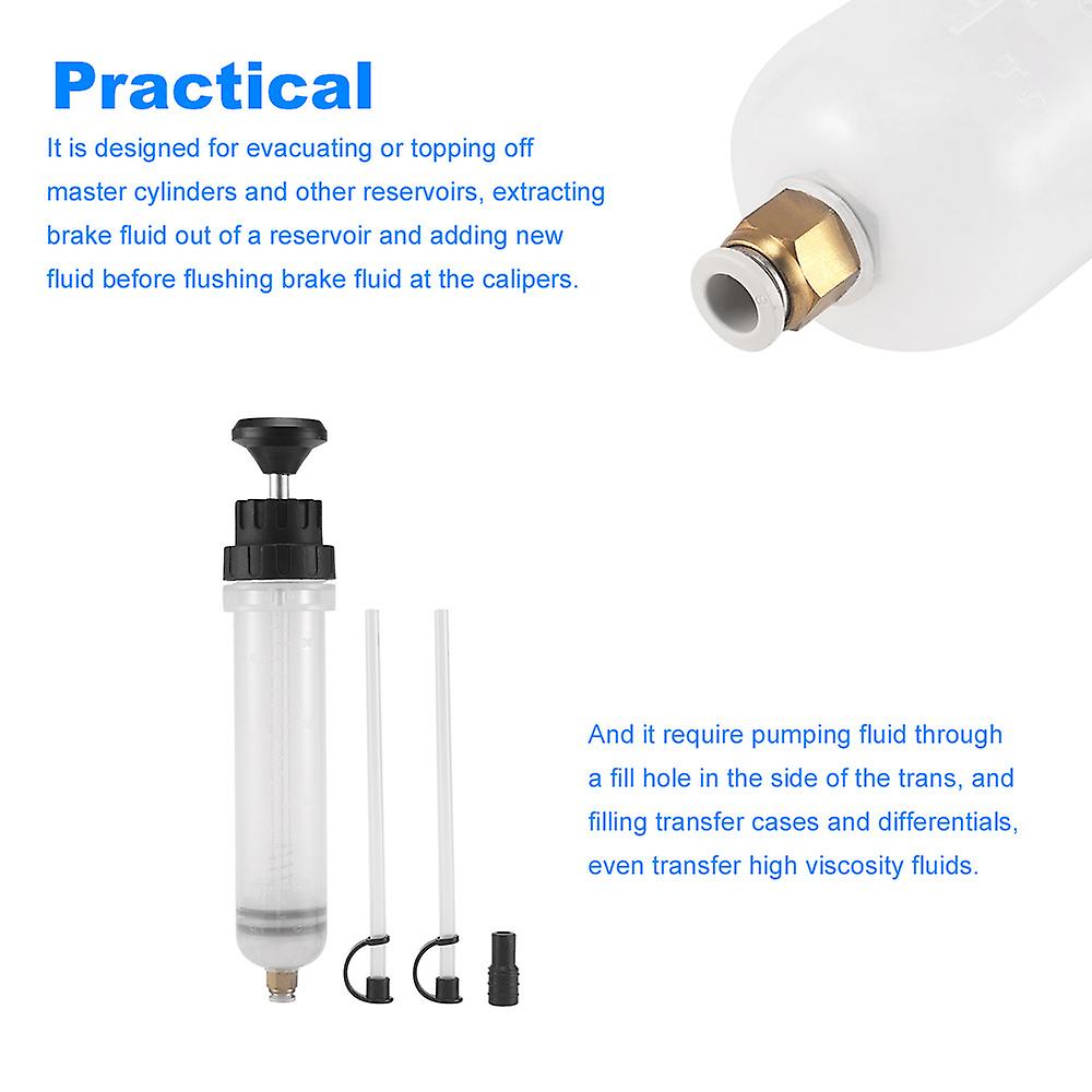 It is designed for evacuating or topping off master cylinders and other reservoirs, extracting brake fluid out of a reservoir and adding new fluid before flushing brake fluid at the calipers.And it require pumping fluid through a fill hole in the side of the trans, and filling transfer cases and differentials, even transfer high viscosity fluids.