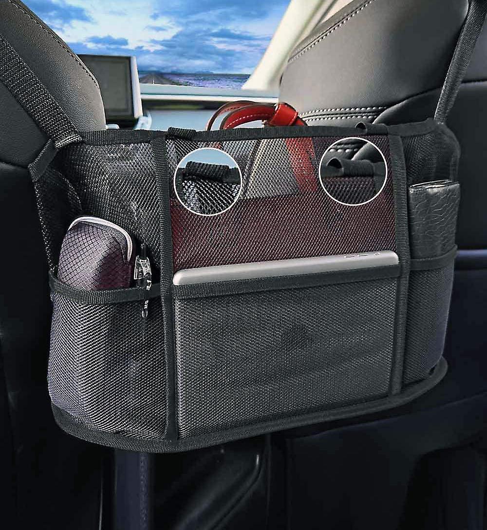 This handbag holder between seats is compatible with most of cars with front opening armrest Box. Our Handbag is designed with two pockets, one large and one small. The big inside pocket can hold magazines, tablets, documents, etc., and the small outside pocket can hold mobile phones, lipsticks, perfumes, etc.