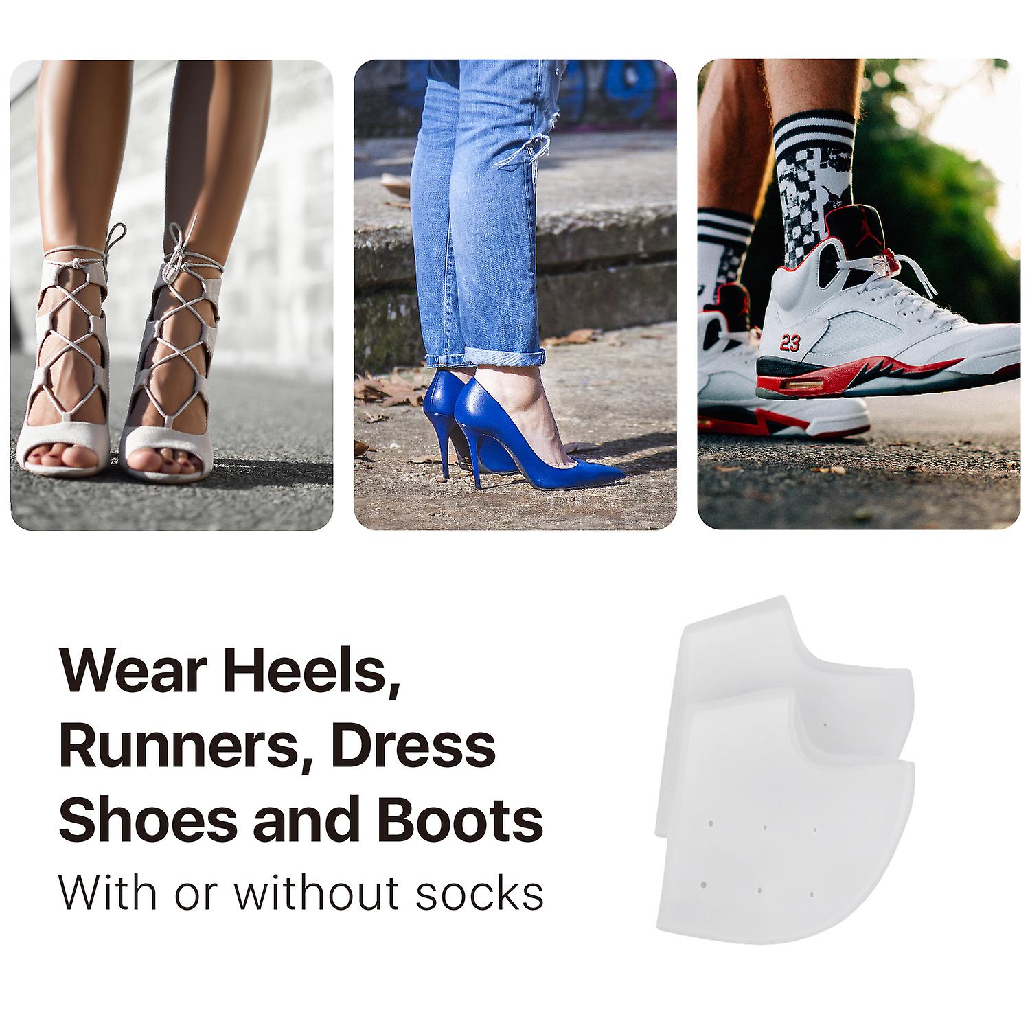 Heel protection: Our heel protectors can comfortably be worn under socks or stockings with sneakers, shoes, boots, or heels in daily life for blister prevention. Our heel cups for heel pain are made of medical-grade silicone and have breathable air holes.