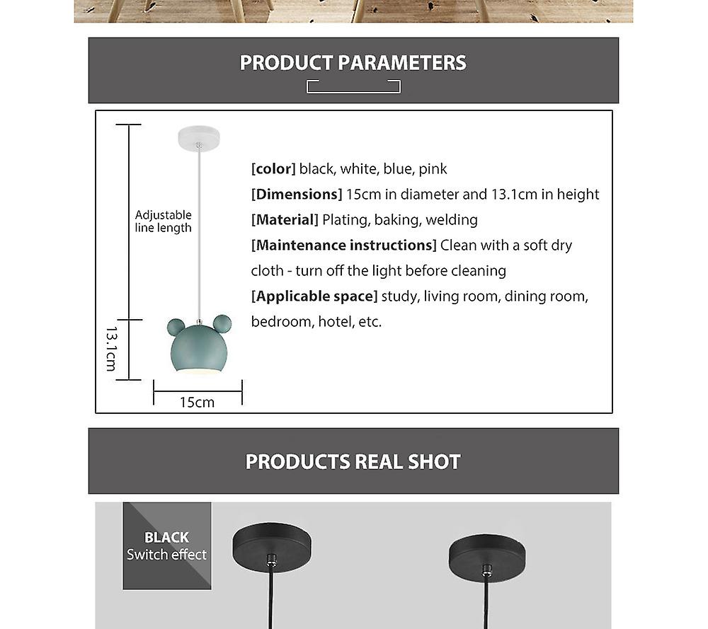 Creative design: The mickey-style chandeliers, a total of 4 colors, lovely design full of childlike, very suitable for installation in children's rooms or playgrounds, not only a lighting tool, but also an interesting ornament
