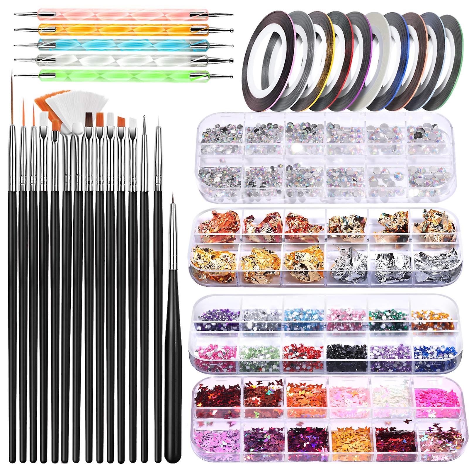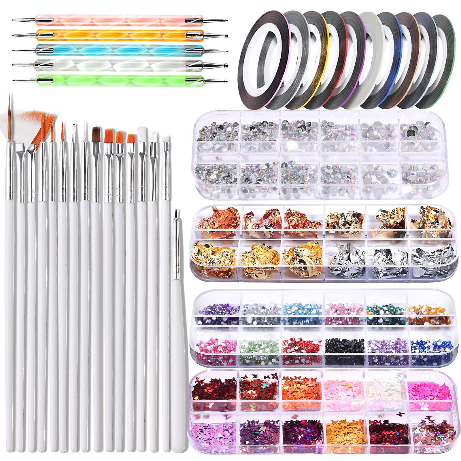 GREAT NAIL ART TOOLS STARTER KIT: including 15pcs precision nail brush + 12pcs design nail paper sheets + 10pcs thin stripe tape rollers + 24pcs boxes of gemstones + 5 mixed size dotting tools + 12 color butterfly nail sequins