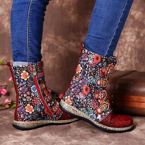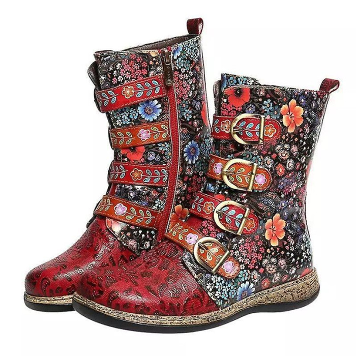 Women Floral Print Ethnic Boots Retro Boho Buckle Flat Boots Zip Up Round Toe Shoes