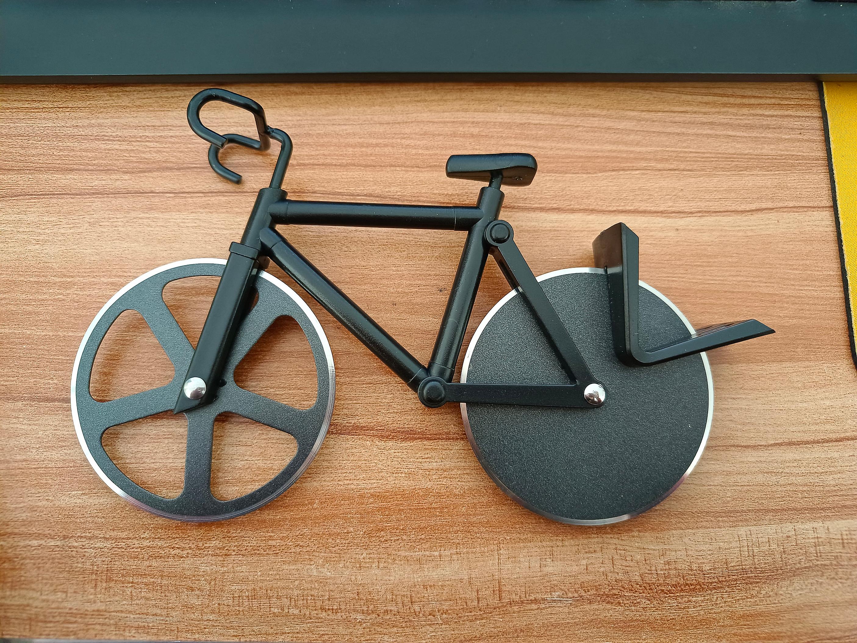 Unique pizza cutter shaped as a fancy fixie bike. Its double cutting wheels system makes it easy to slice your pizza.